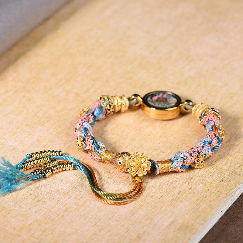 Combining Tibetan thangka-inspired patterns, ethnic-style weaving, and a rich color palette associated with wealth and fortune, this bracelet blends cultural heritage with spiritual symbolism.